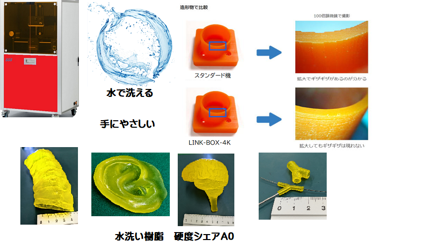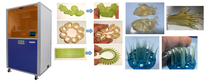 2つのコーターと洗浄槽を搭載し、複合造形を実現するダブルコーター方式の3Dプリンタ です。2種類の材料を使用した複合造形を光造形では業界で初めて実現しました。